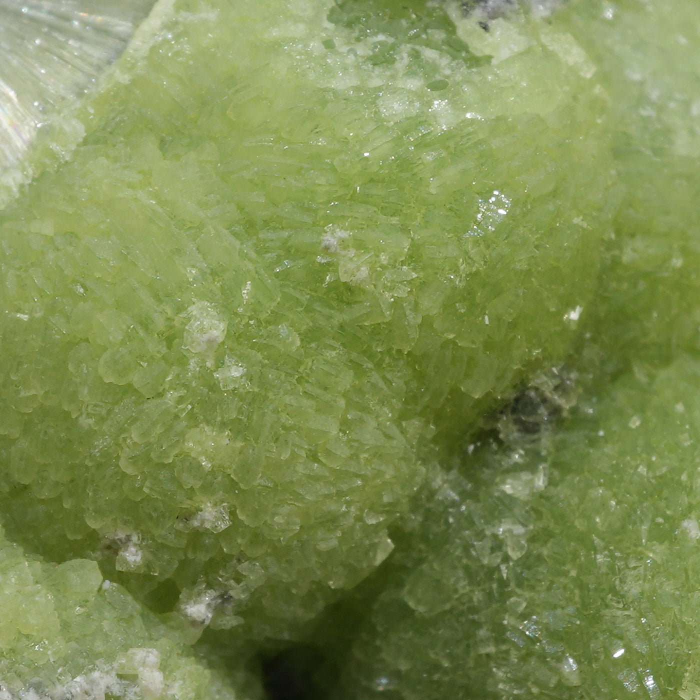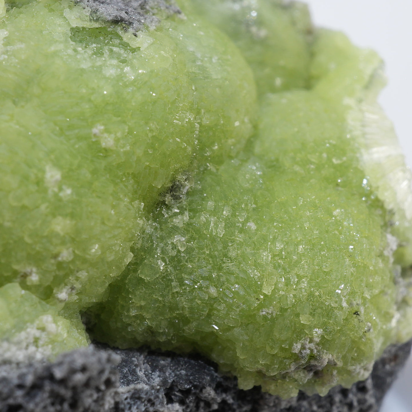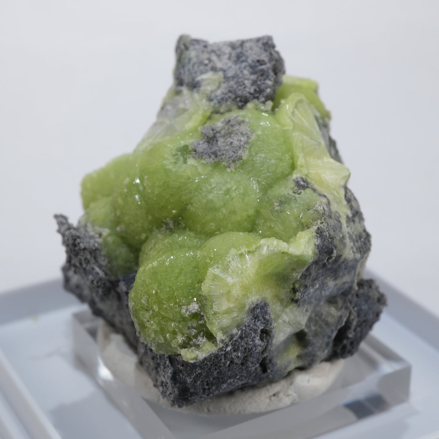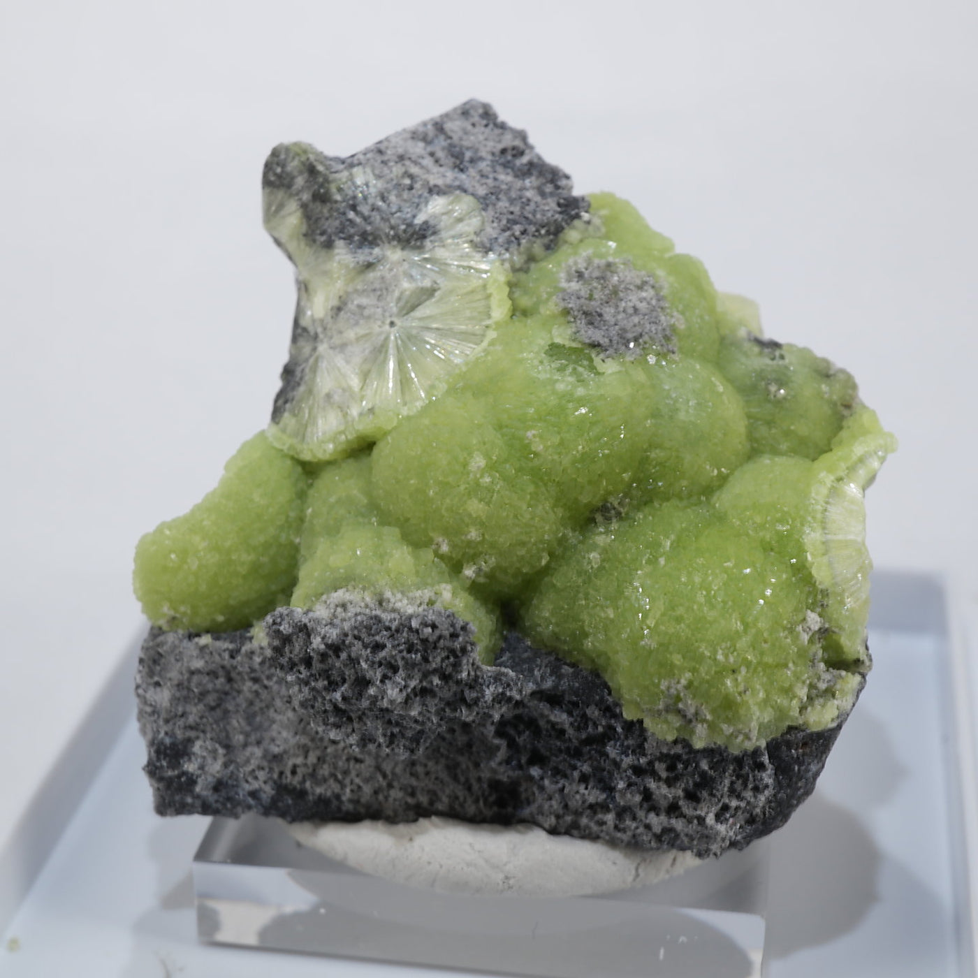 鮮やかな黄緑色の球状の結晶が印象的な標本です。結晶の断面は放射状に広がっているのが特徴です。