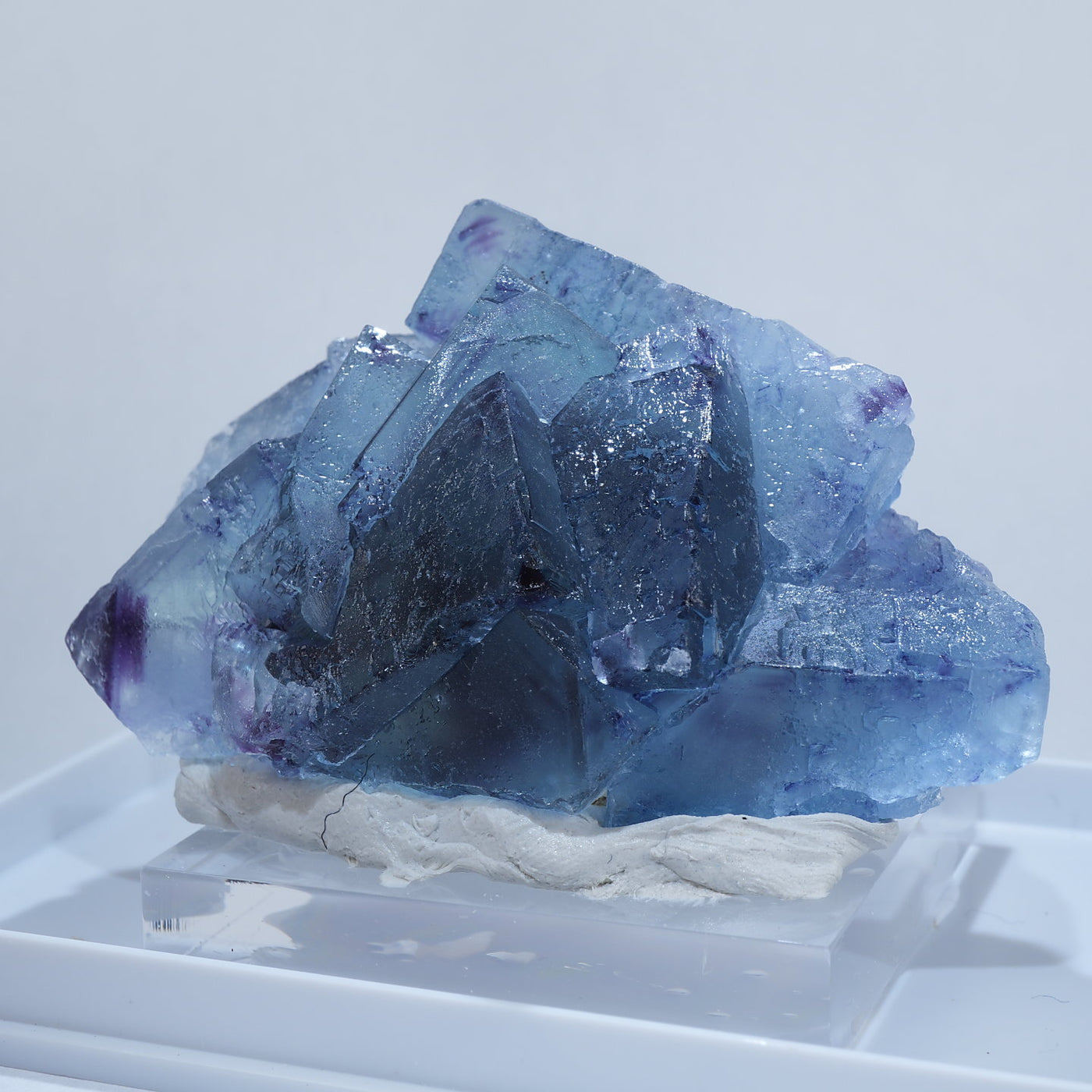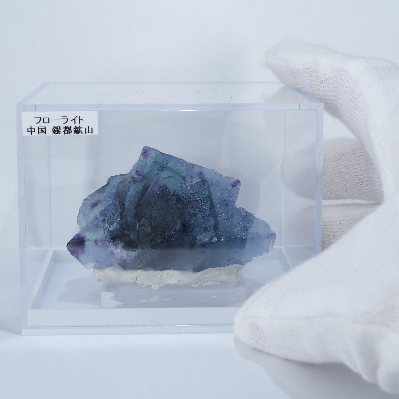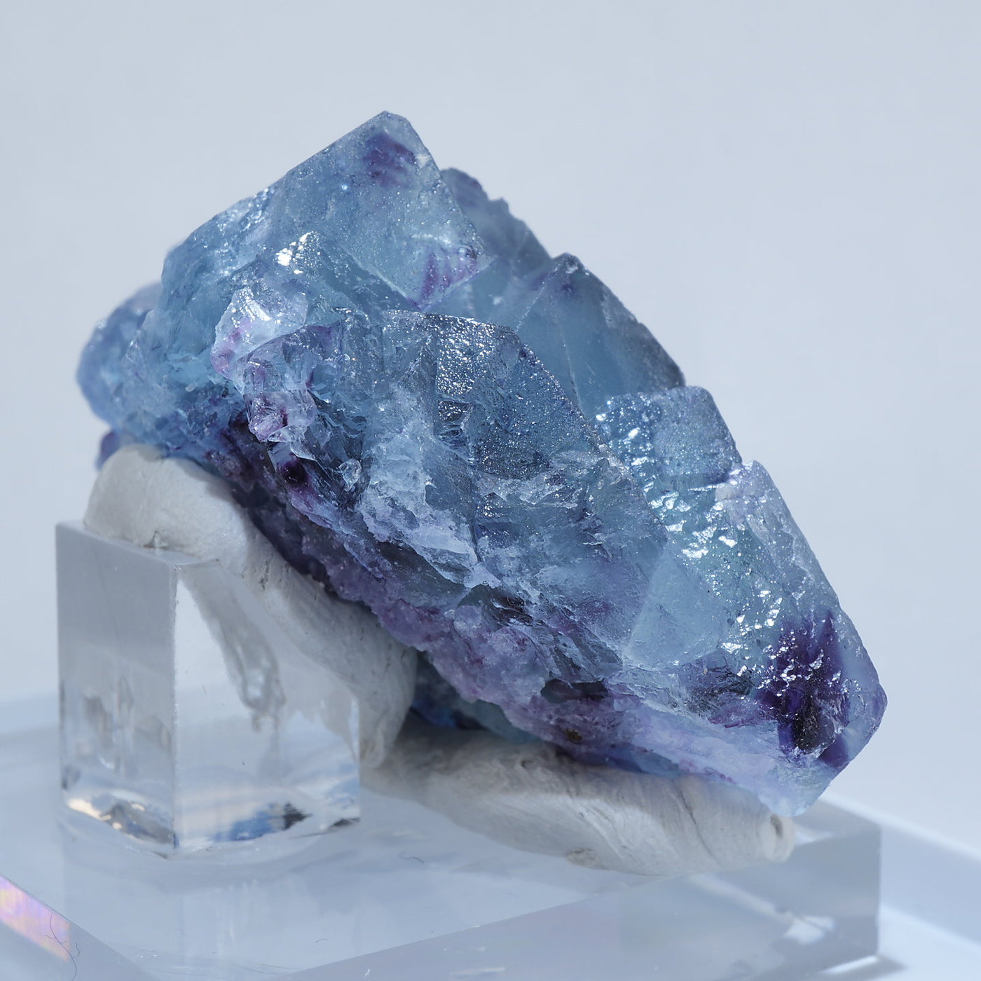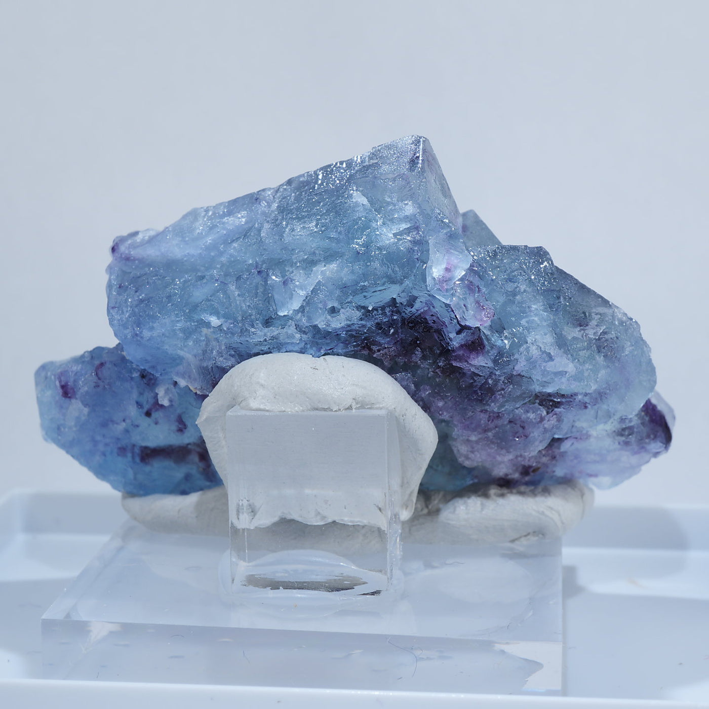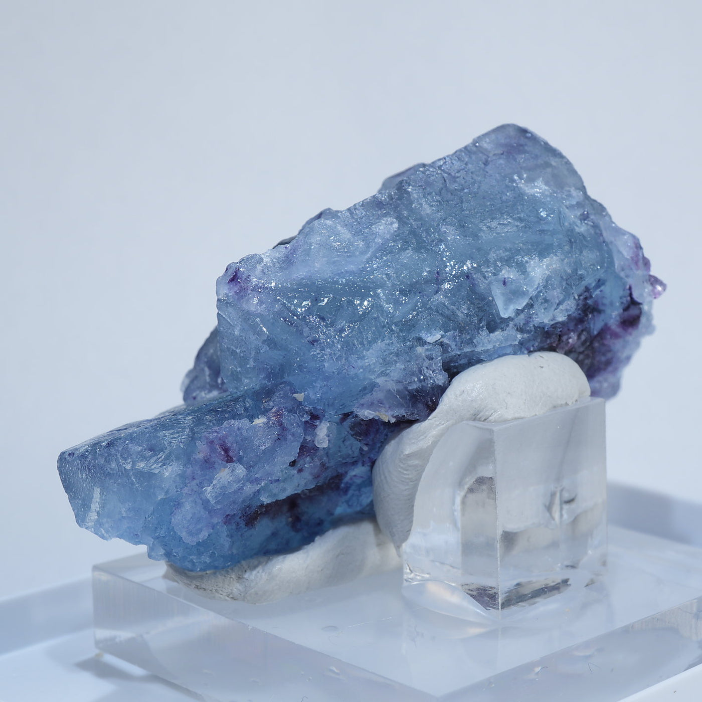 全体は淡い水色をしており、部分的に紫色がみられる美しい標本です。紫外線ライトを当てると蛍光します。