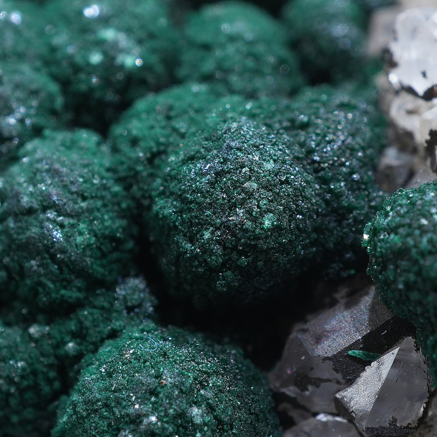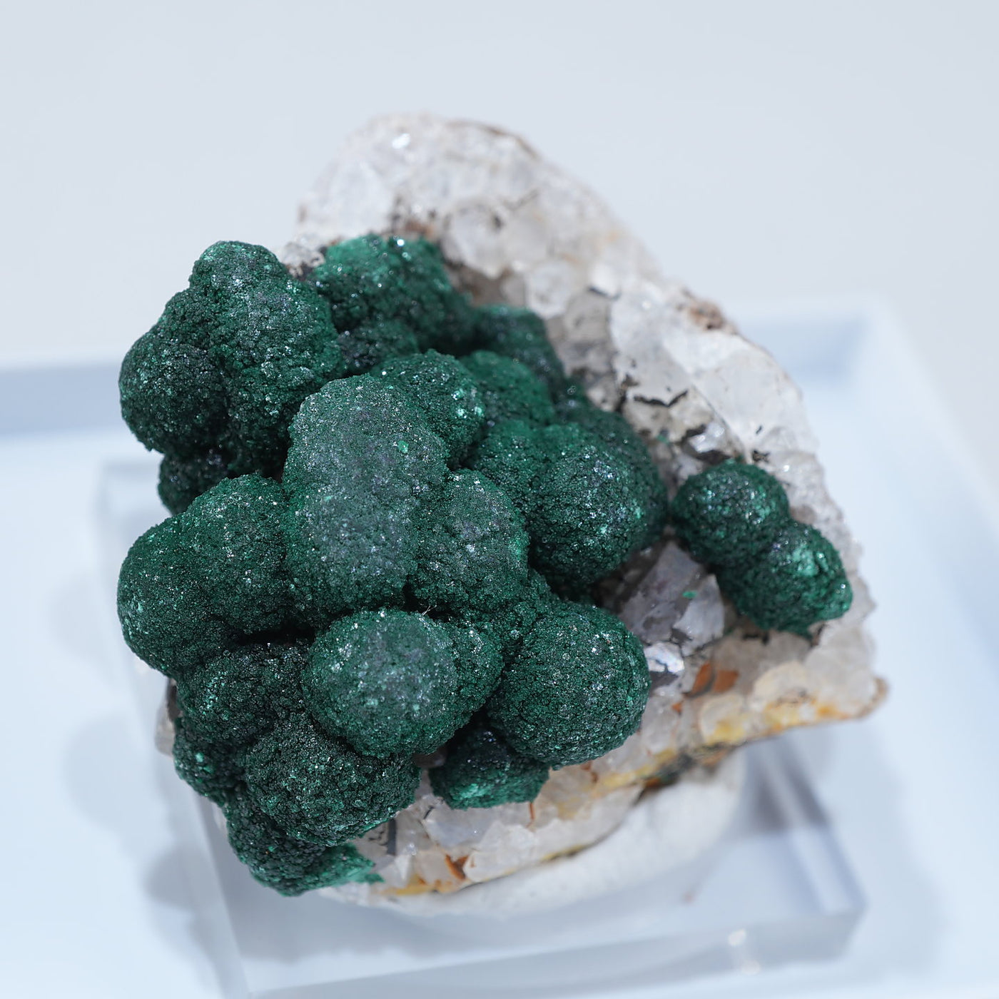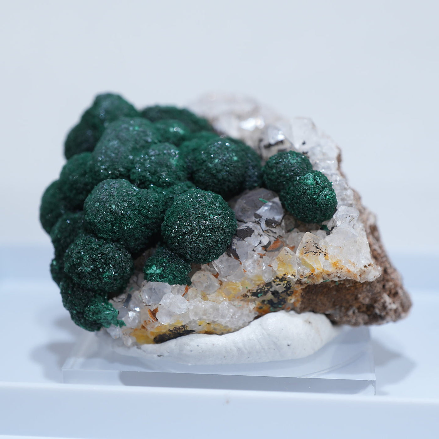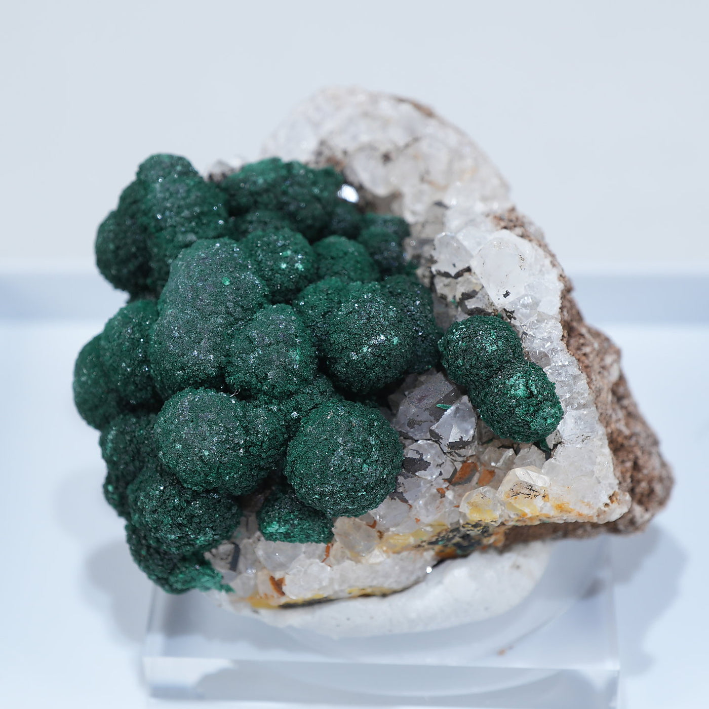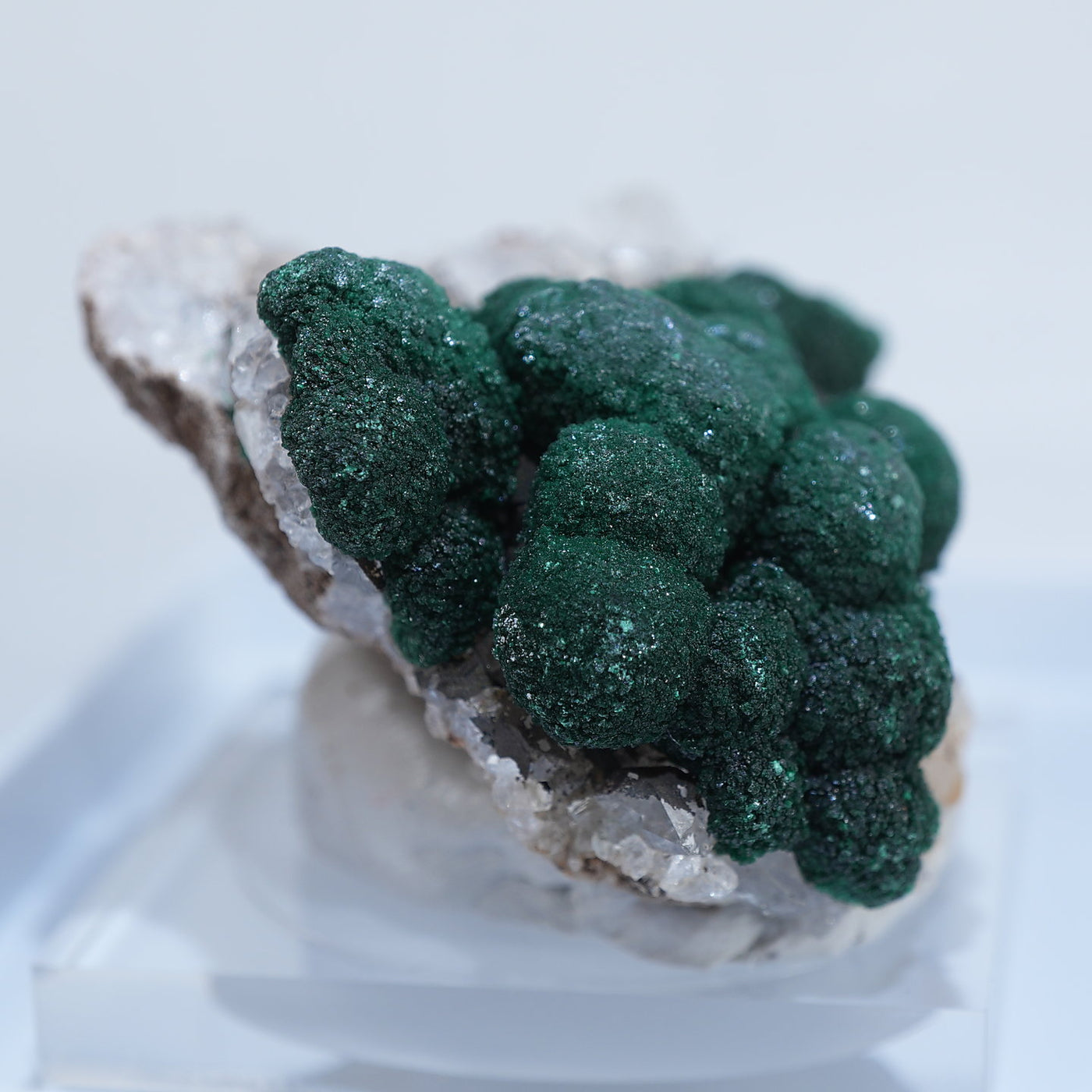 球状の鮮やかな濃いグリーンの美しい標本です。母岩とのコントラストも綺麗です。