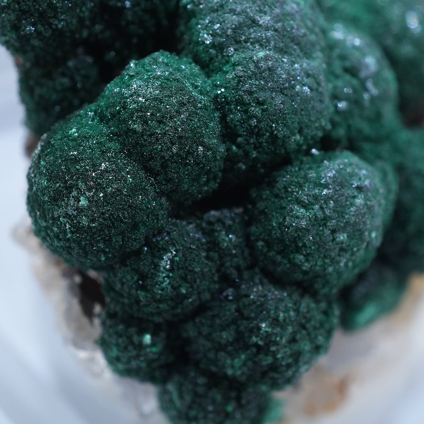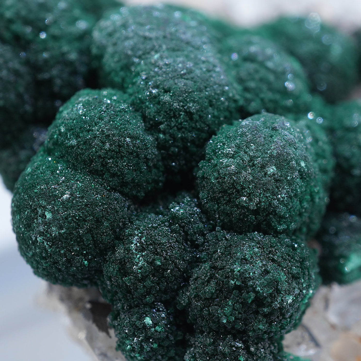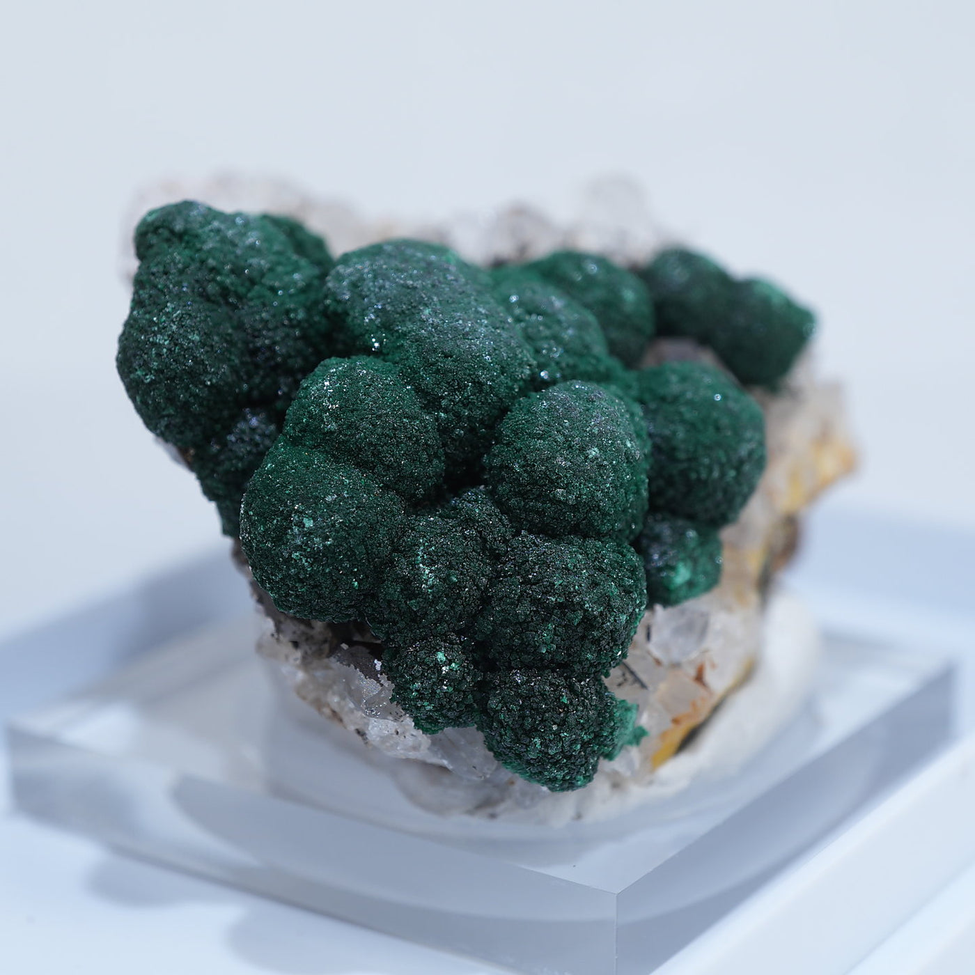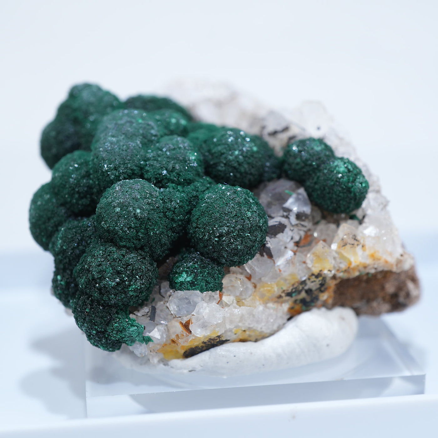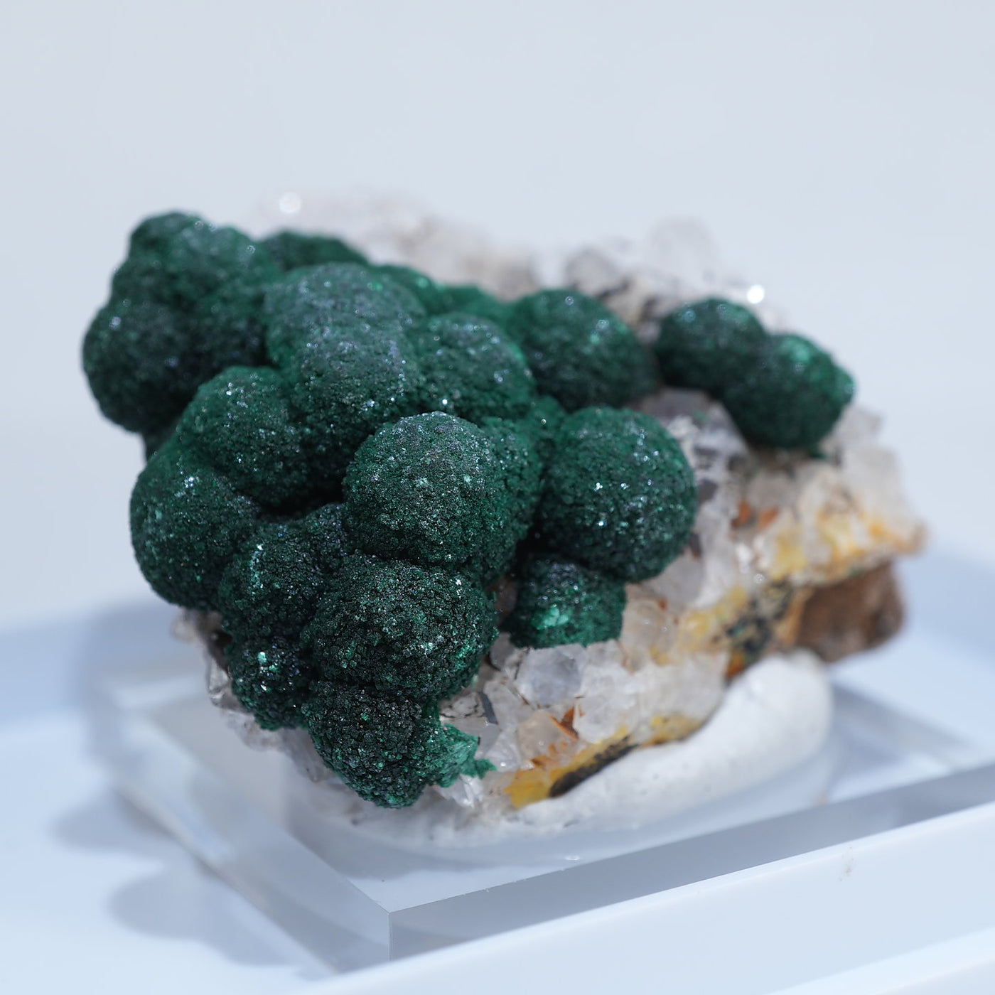 球状の鮮やかな濃いグリーンの美しい標本です。母岩とのコントラストも綺麗です。