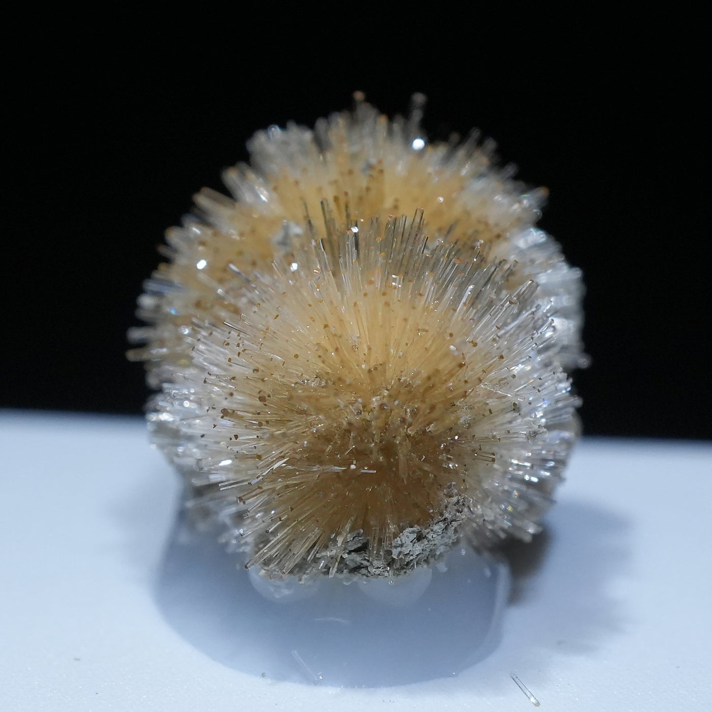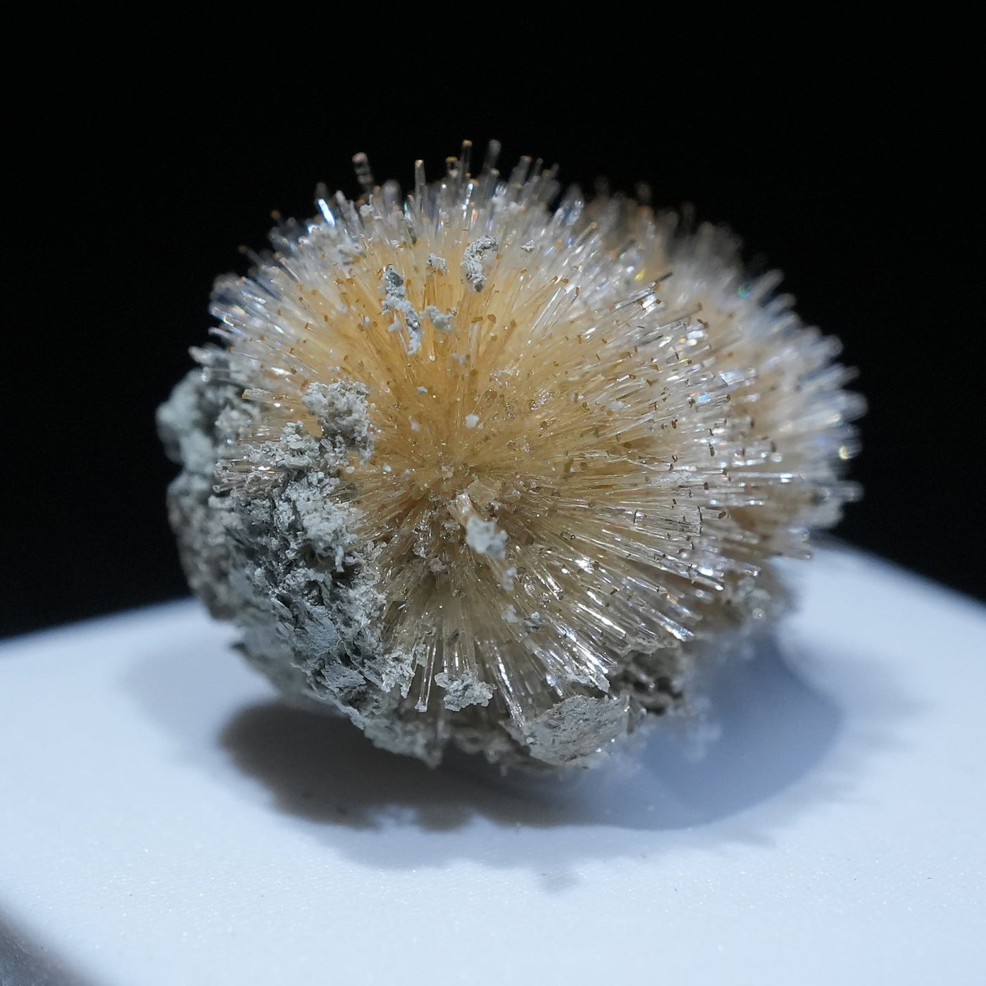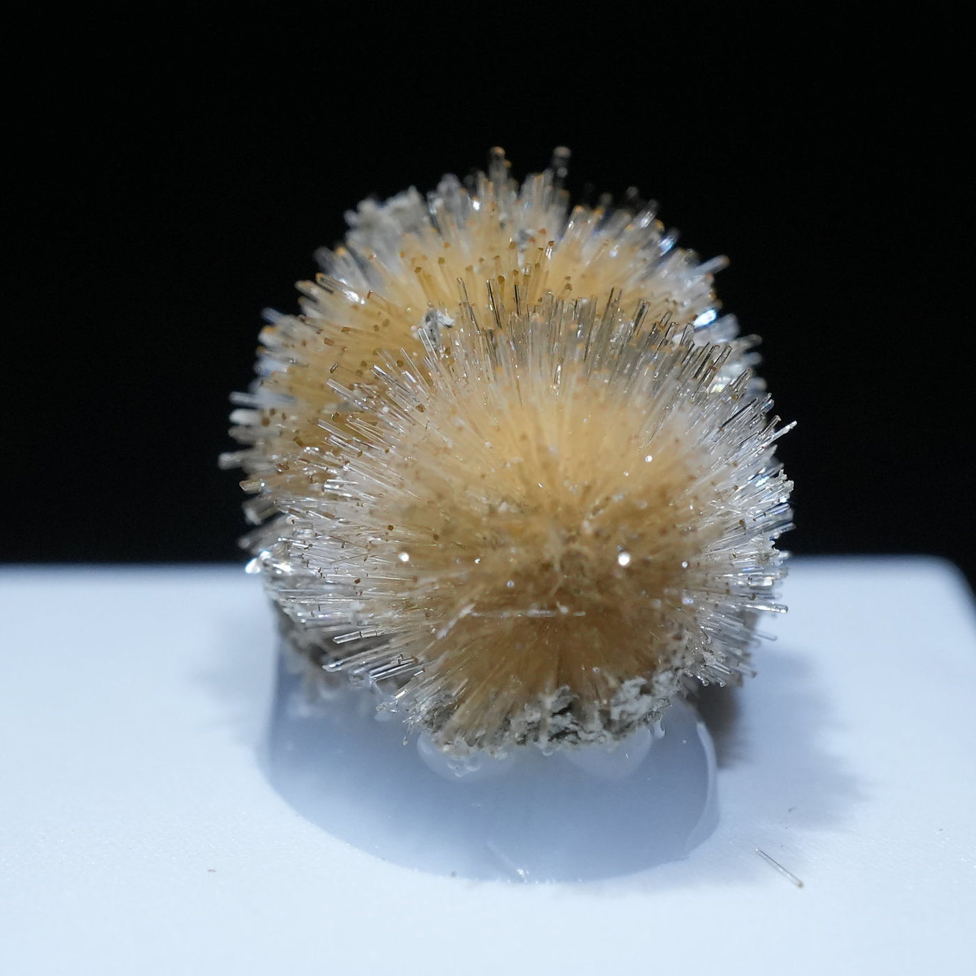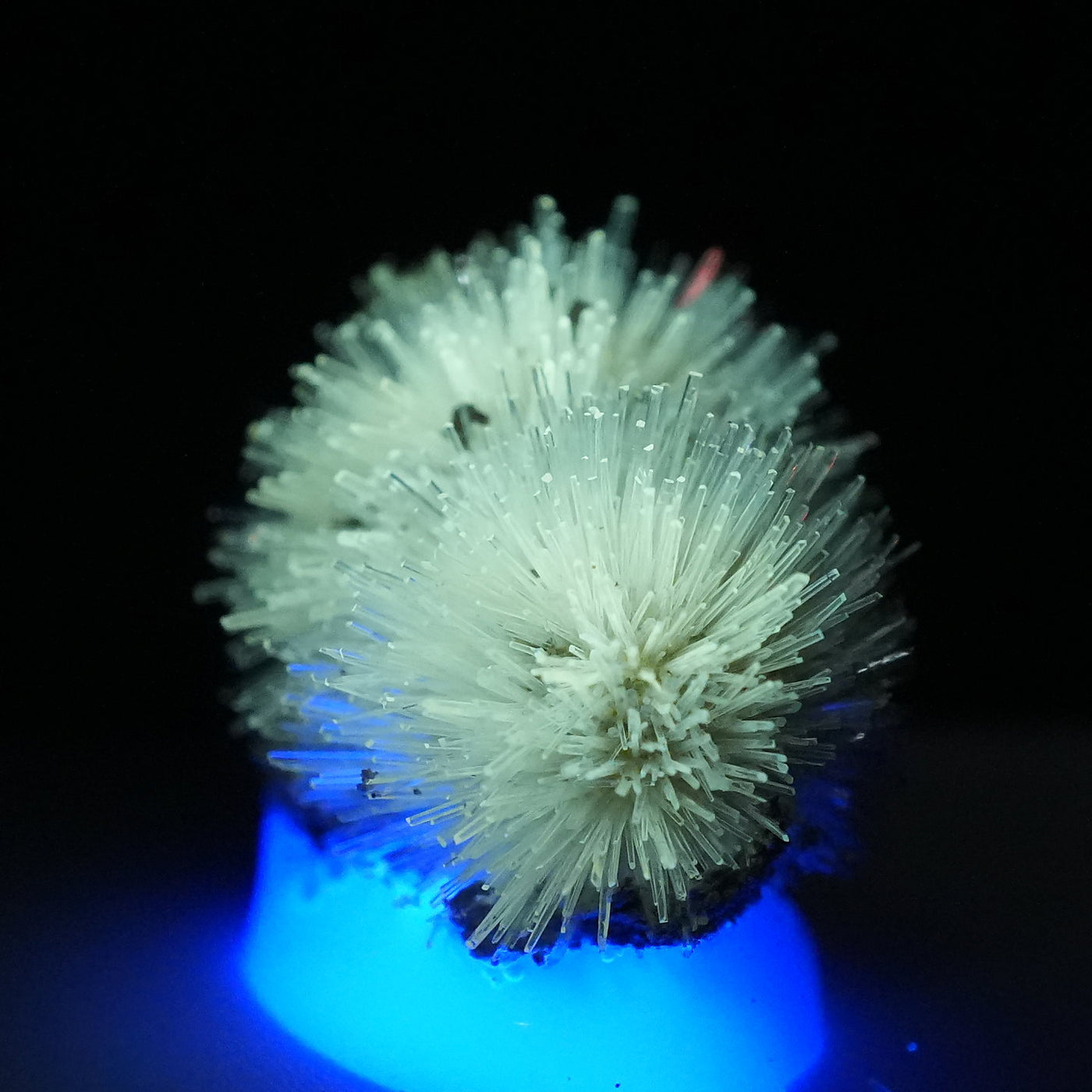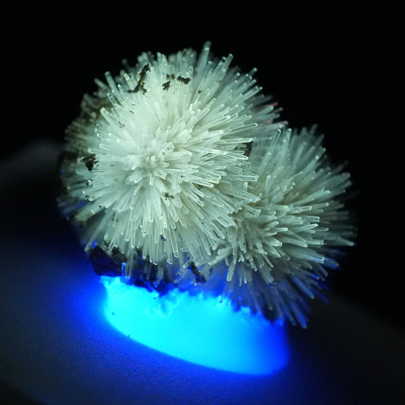 針のように繊細な結晶が四方に広がる丸いウニのような形状が特徴的です。紫外線ライトを当てると青白くと蛍光します。