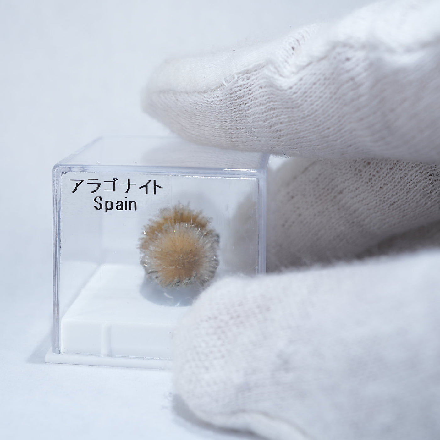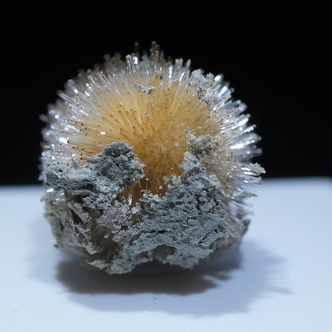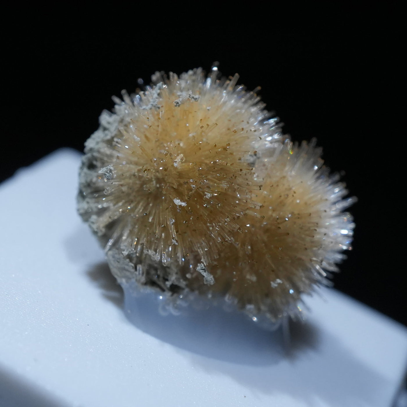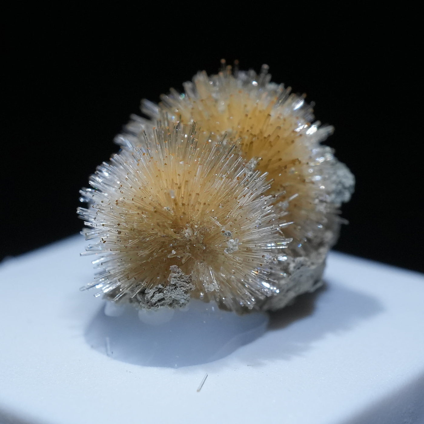 針のように繊細な結晶が四方に広がる丸いウニのような形状が特徴的です。紫外線ライトを当てると青白くと蛍光します。