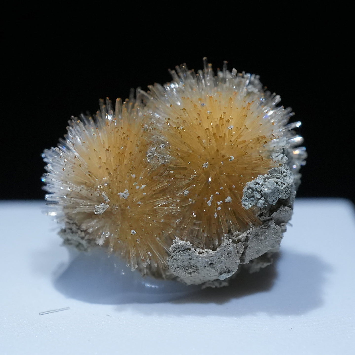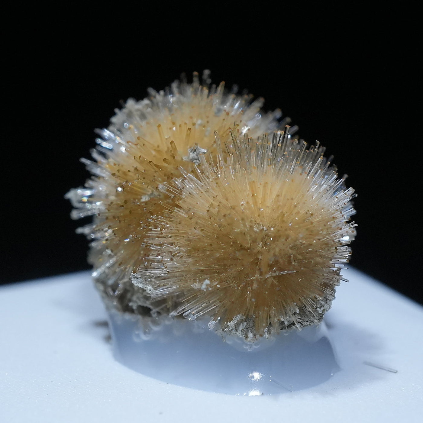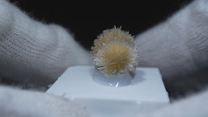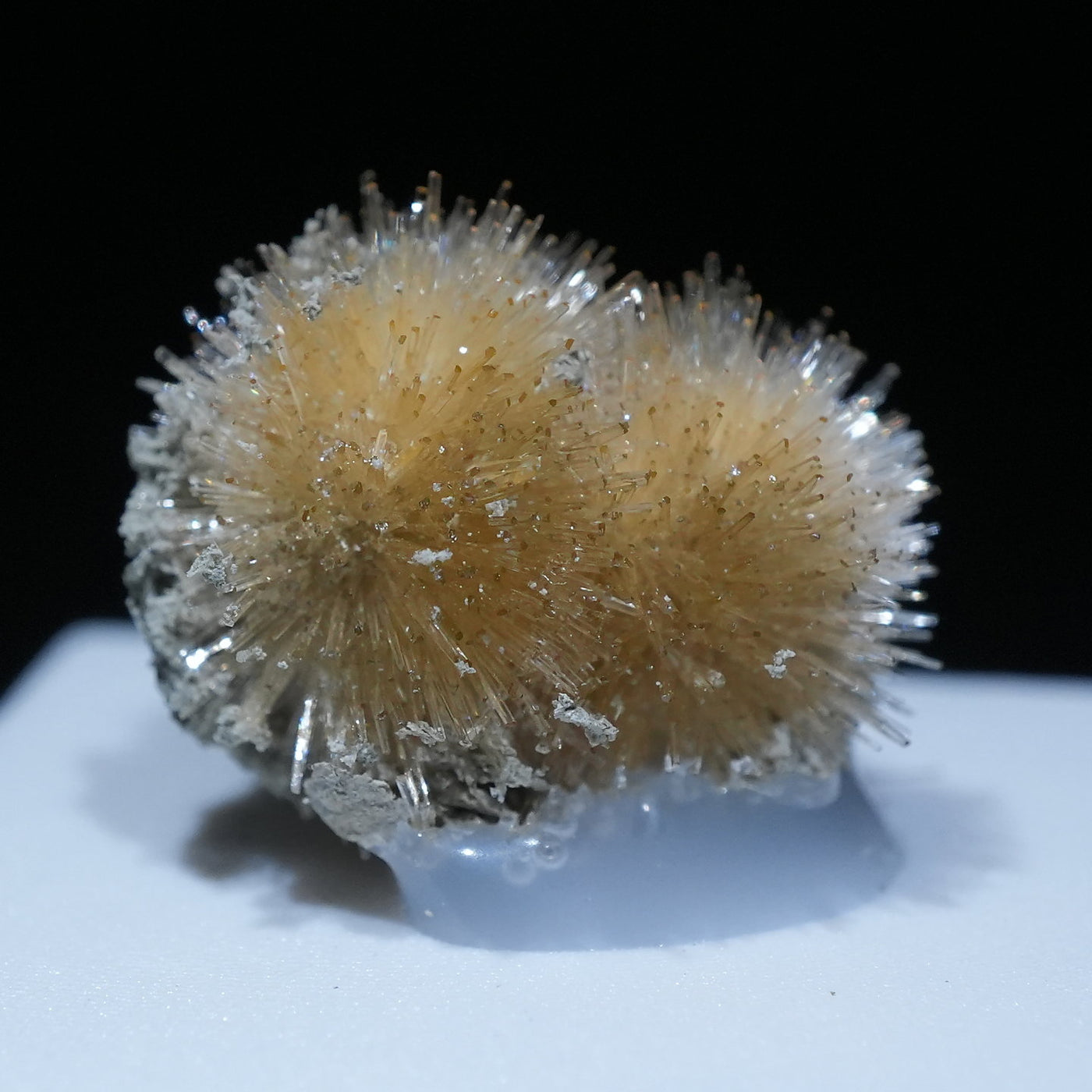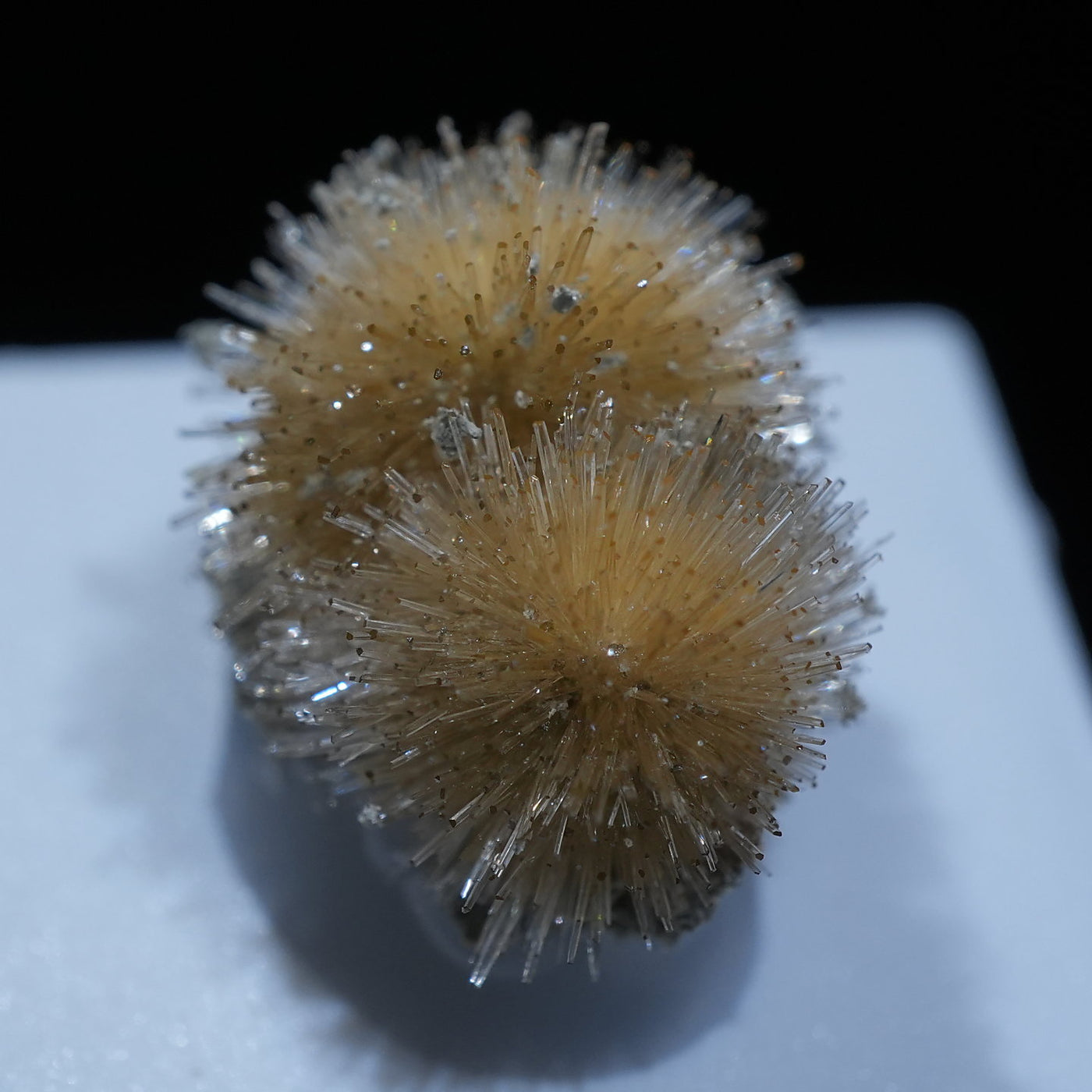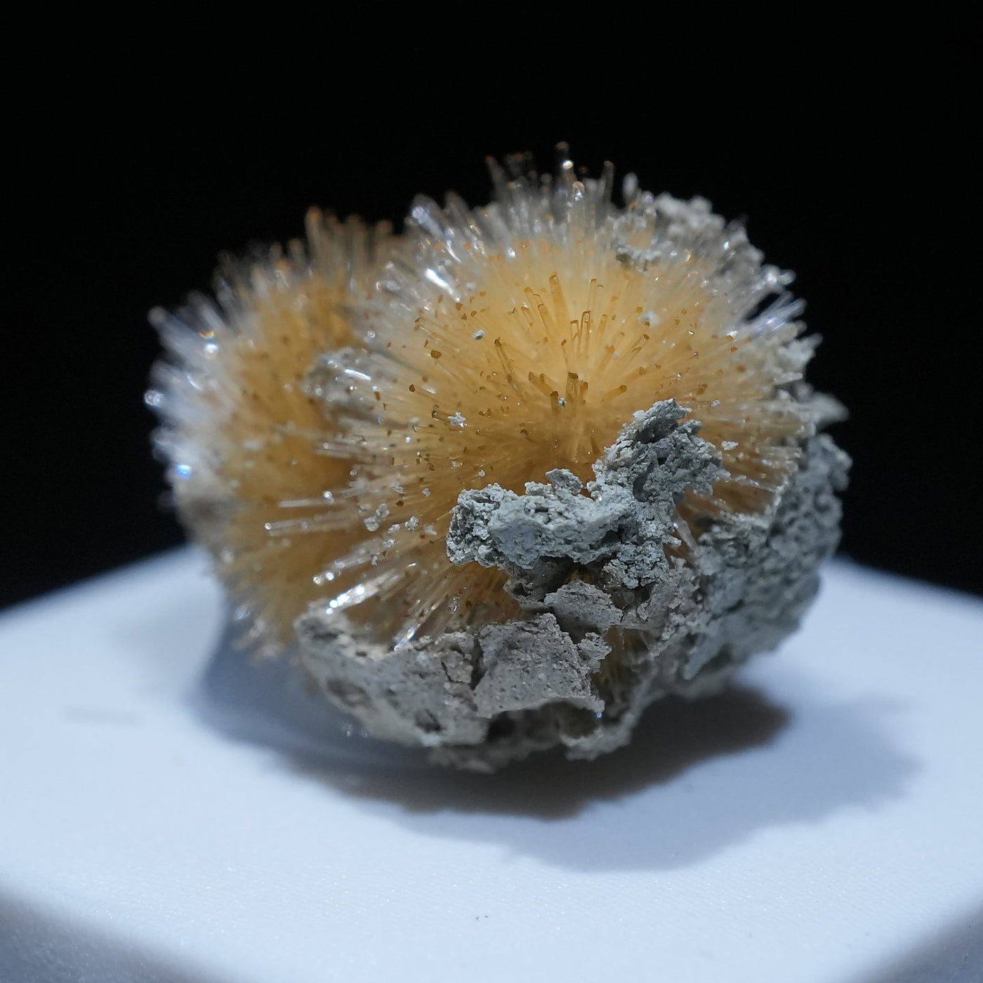 針のように繊細な結晶が四方に広がる丸いウニのような形状が特徴的です。紫外線ライトを当てると青白くと蛍光します。